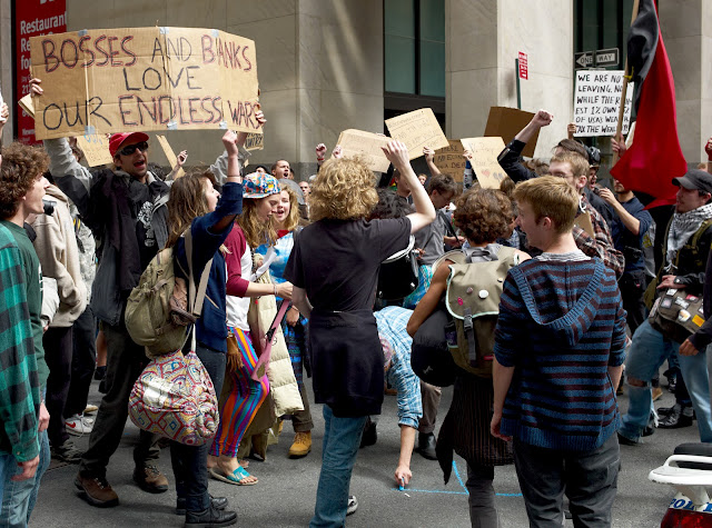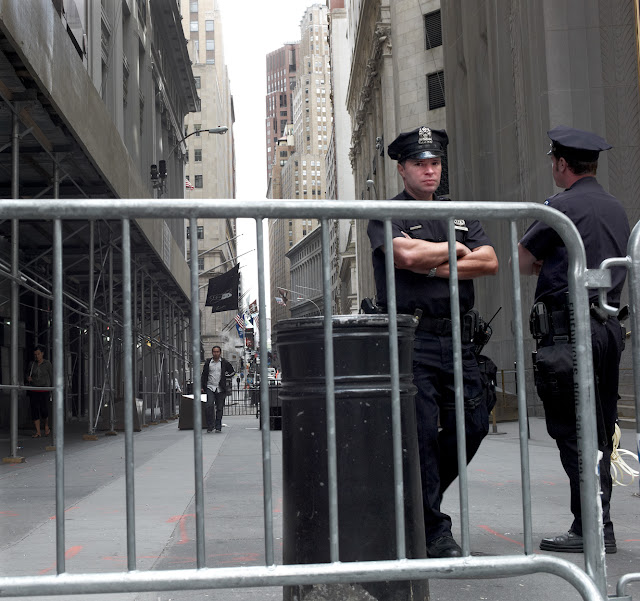 The tourists hardly noticed the 300 or so folks of the General Assembly and allied groups sprawled about Zuccotti Park .Many had camped overnight at the leave of NYPD in the park .By mid-day most were up and about preparing to shut down Wall street .Some were concerned with the day's agenda ,some made posters , some made music and danced while the more militant sorts marched through the streets ,led by a black and red flag to a corner near Wall Street . Tomorrow Wall Street .