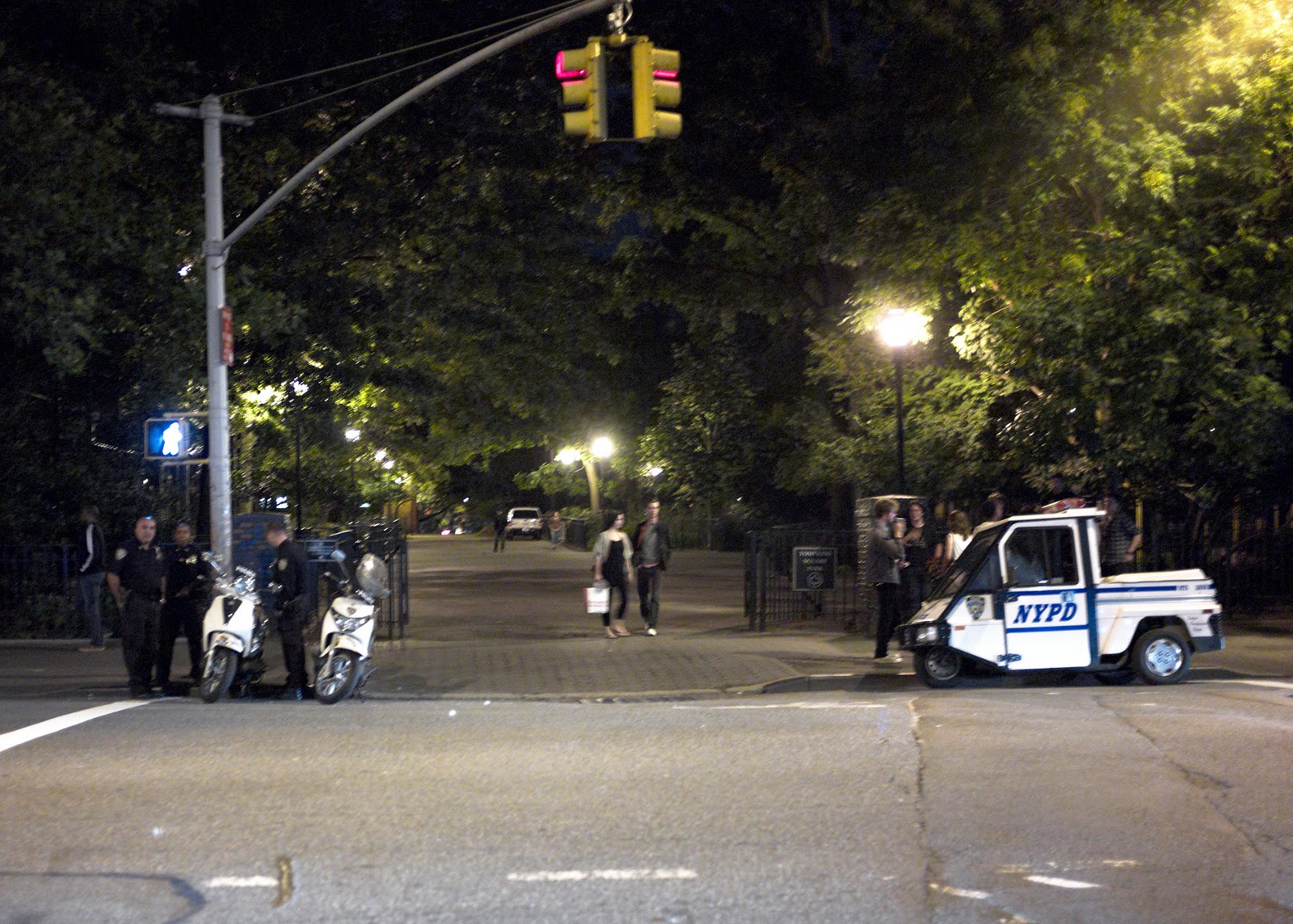 Friday night NYPD made its presence known in Tompkins Square Park . 8 or more scooters from the 1st precinct were stationed at the corner of Avenue A and Saint Marks Place . Several other police vehicles were also present on Avenue A , 10th street and in TSP . Patrols were conducted through out TSP by car , scooter and on foot .