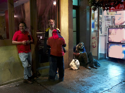 As Jim fought back standing his ground at his little resting place under some scaffolding , the 3 middle aged drunks gave up the contest and left heading down avenue A to ray's candy store . Jim followed them at a distance .Jim wasn't hurt too badly just some bruises and scrapes .